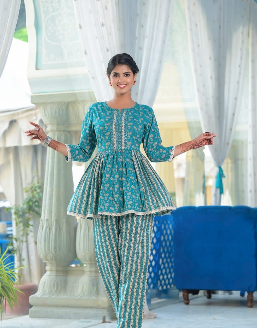 This co-ord consists of an peplum top and striped trousers. Peplum top, has neck embroidery work, gather styled, white cotton lace and a curved hem. Matching ankle length trousers, has an elasticated waistband with a slip on closure.