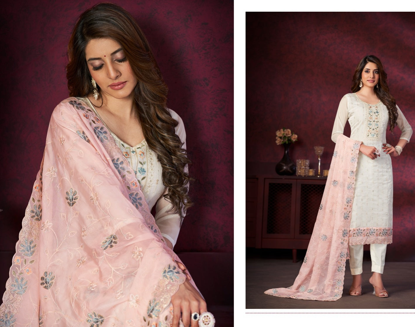 This 3 piece set consists of a unstitched top, dupatta, lining and trouser. Ivory Top, is made up of organza, embellish work, shantoon lining and beautiful neck embroidery. Trouser is a plain shantoon fabric measuring approx 2.5m. Dupatta is of organza, lengthing 2.4m approx.
